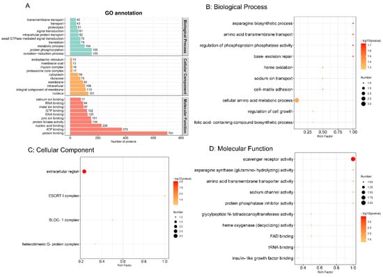 Gene Ontology (GO) functional annotation (A) and enrichment analysis (B) The top 10 biological processes. (C) Four cellular components. (D) The top 10 molecular functions. (p value ≤ 0.05). The colour scales indicate the different p values, and the sizes of the circles represent the number of proteins enriched in each GO term.