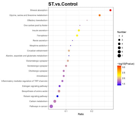 Bubble chart of Kyoto Encyclopaedia of Genes and Genomes (KEGG) enrichment analysis with a p value ≤ 0.05. The horizontal axis ratio represents the ratio of differential protein numbers and total numbers identified in this pathway. The colour scales indicate the p values of the t test, and red represents a higher statistical significance. The sizes of the circles are related to the number of DEPs enriched in each pathway.