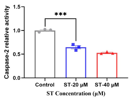 The enzyme activity assay was taken to verify the expression level of CASP2 after adding stemazole. Compared with 40 μM of stemazole in proteomic study, we also added another concentration 20 μM to further investigate the different protein expression level compared to control group. When adding stemazole to reach the target concentration, it can significantly decrease the protein level by 35% and 46%, respectively, which indicated the caspase 2 is a key factor for regulating the survival of human neural stem cells affected by stemazole (Figure 5).