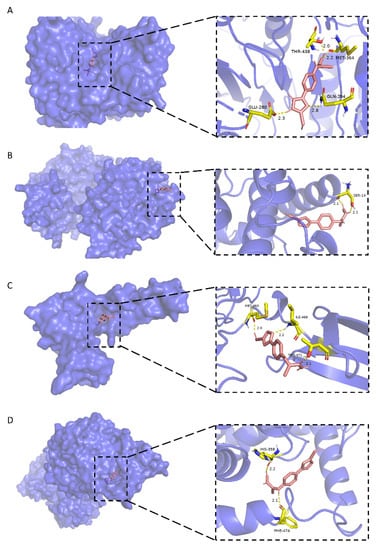The 3D structures of proteins were obtained from the Protein Data Bank (PDB) database [39,40] (https://www.rcsb.org/, accessed on 16 March 2022). The water and heteroatoms were removed by using Yinfo Cloud Computing Platform (https://cloud.yinfotek.com/, accessed on 16 March 2022). Subsequently, AutoDock Tools 1.5.7 was used to process the receptors and ligand. Relative grid box parameters are represented in Table 3. Molecular docking was carried out by the Lamarckian genetic algorithm of AutoDock 4.2 software with default values (https://autodock.scripps.edu/, accessed on 16 April 2022) [41]. The best conformations with low binding energy were selected and 3D docking diagrams were displayed by PyMOL 2.5.2. (https://pymol.org/2/, accessed on 16 April 2022).