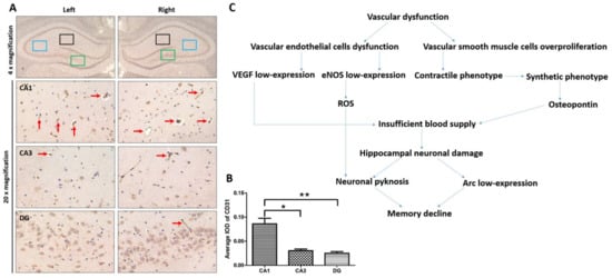 Analysis of hippocampal blood vessels and the relationship between vascular dysfunction and neuronal damage. (A) CD31 immunohistochemical staining of blood vessels (red arrows) in the rat bilateral hippocampus. In 4× magnification images, the circled rectangles in the different regions of the hippocampus were magnified by 20×. Black rectangles represent CA1, blue rectangles represent CA3, and green rectangles represent DG. (B) Integrated optical density (IOD) values of CD31. * p = 0.0027 vs. CA3, ** p = 0.0019 vs. DG. (C) The schematic diagram demonstrates the transition from vascular dysfunction to neuronal damage in the study. Statistics data were presented in Table 1.