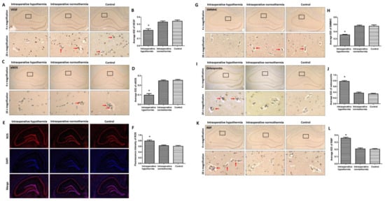 Intraoperative hypothermia leads to endothelial dysfunction and the phenotypic transformation of vascular smooth muscle cells. (A–D) Immunohistochemical staining of vascular endothelial growth factor (VEGF) and endothelial nitric oxide synthase (eNOS) in rat hippocampus and summary integrated optical density (IOD) values. * p = 0.0051 vs. Control, in quantification of VEGF; * p = 0.0001 vs. Control, in quantification of eNOS; * p = 0.0077 vs. Control, in quantification of ROS. (E,F) Reactive oxygen species (ROS) fluorescence staining of rat hippocampus and fluorescence intensity (4× magnification). (G–L) Immunohistochemical staining of smooth muscle myosin heavy chain (SMMHC), osteopontin, and retinol binding protein (RBP) in rat hippocampus and summary IOD values. * p = 0.0007 vs. Control, in quantification of SMMHC; * p < 0.0001 vs. Control, in quantification of Osteopontin; * p = 0.0001 vs. Control, in quantification of RBP. In 4× magnification images, black rectangles in the CA1 region are selected to perform 20× magnification. Intraoperative hypothermia: rats experienced hypothermia during surgery. Intraoperative normothermia: rats maintained normal body temperature during surgery. Control: rats were fed normally without operation. Statistics data were presented in Table 1.