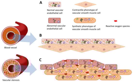 Blood vessels are composed of vascular endothelial cells (VECs) and vascular smooth muscle cells (VSMCs). For VECs, endothelial nitric oxide synthase (eNOS) is the key functional molecule that catalyzes nitric oxide to dilate blood vessels and ensure blood supply [21]. Vascular endothelial growth factor (VEGF) is responsible for the survival of VECs, which is required for angiogenesis and the maintenance of endothelium integrity [22,23]. Functionally, VSMCs can be divided into contractile and synthetic phenotypes according to different characteristics [24,25]. Their phenotypic transformation is involved in the pathophysiology. Physiologically, marked by the presence of smooth muscle myosin heavy chain (SMMHC), VSMCs are in the state of contractile phenotype, which regulates vascular tension to control blood supply. In response to pathological stimulation, VSMCs are transformed to the synthetic phenotype with the expression of osteopontin. The phenotypic transformation induces VSMCs proliferation and migration, eventually leading to the overexpression of retinol-binding protein (RBP) and stenosis of the vascular lumen [26,27].
