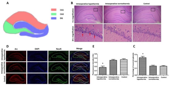 Histopathology of the hippocampus caused by intraoperative hypothermia. (A) Cross-sectional diagram of rat unilateral hippocampus with three regions encoded by different colors. (B,C) Neuronal pyknosis (red arrows) detected by H&E staining and summary results. Black rectangles in the CA1 region are selected to perform 20× magnification. * p = 0.0015 vs. Control. (D,E) Representative immunofluorescence (4× magnification) staining for Arc in the hippocampus. The red fluorescence shows Arc expression. The blue fluorescence represents nuclei stained with 4′,6-diamidino-2-phenylindole (DAPI). The green fluorescence shows neurons labeled with NeuN. In the merged figure, the CA1 region is framed in a dotted line. * p = 0.0026 vs. Control. Intraoperative hypothermia: rats experienced hypothermia during surgery. Intraoperative normothermia: rats maintained normal body temperature during surgery. Control: rats were fed normally without operation. Statistics data were presented in Table 1.