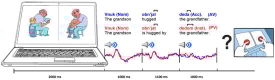 “Who did what to whom”—is the key question for successful sentence comprehension. The development of a child’s language mainly follows the path of improving the processes of establishing thematic relationships of words in a sentence. Speech comprehension is based on context and semantics and is verified by syntax [1,2,3]. Therefore, the mechanisms of semantic analysis are formed earlier than those of syntactic analysis in ontogenesis [2,4,5,6]. When it is impossible to unambiguously interpret thematic roles relying on semantics (for example, in transitive sentences with both animated subject and object), reliance is made only on grammatical cues such as word order, voice, case marking, etc. [6,7]. Sentence comprehension is realized differently between the ages of two and four, when word order is critical for children, and between the ages of five and seven, when children rely more on upon case marking for sentence interpretation [6,7,8]. Children can detect grammatical case-marking cues, by the age of three, but they start using this information to determine who is doing what to whom in a sentence only at the age of six [9,10,11]. In a situation of conflict between two cues, word order and case marking, children could rely on case marking over word order only by the age of seven [7]. Understanding complex syntax can be difficult for children as young as six, nine or even 12 years of age [12,13,14,15]. Semantic-independent syntax activity is only established at ages 9 to 10 [16]. Thus, the improvement of syntax skills continues for a long time in ontogeny and may depend on the language.
