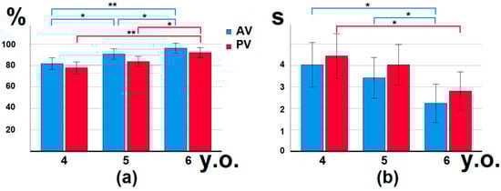 In each age group, the percentage of correct answers and reaction time (RT) of the sentence-picture matching task was calculated and post-hoc analysis was made using the Wilcoxon matched-pairs test for each sentence type (AV vs. PV). Differences were considered statistically significant at p ≤ 0.05.