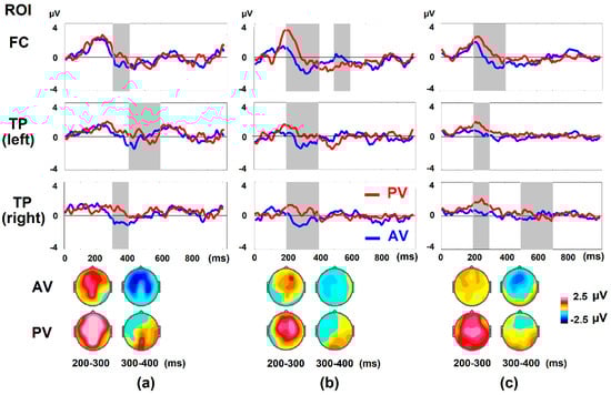 Average ERP amplitudes in the frontocentral (FC) and temporoparietal (TP left and TP right) ROIs from the beginning of NP2 in sentences with active (AV—blue) and passive (PV—red) voice. Time in ms is on the x-axis, and amplitude in µV is on the y-axis. Topography of ERP averaged for AV and PV in 100 ms TWs: 200–300 and 300–400 ms. (a)—four-year-old children (n = 13), (b)—five-year-old children (n = 14), (c)—six-year-old children (n = 16). The intervals of significant differences in the mean ERP amplitudes p < 0.05 are highlighted in gray.