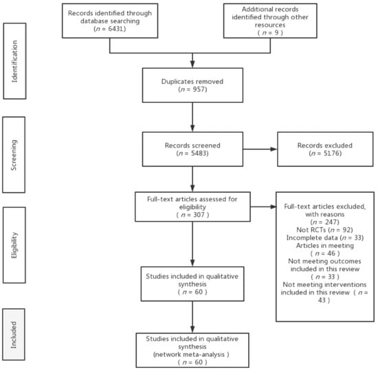 A total of 6431 documents were retrieved from the electronic database, and an additional nine documents were manually searched. After eliminating duplicates, the remaining 5483 documents were read for titles and abstracts, and 5176 documents were again excluded. The remaining 307 documents were read in full and 247 documents were again excluded (for reasons including non-randomised controlled trials, incomplete data, conference papers and failure to meet the interventions included in this review), leaving a final remaining 60 documents to be included in this study (Figure 1).