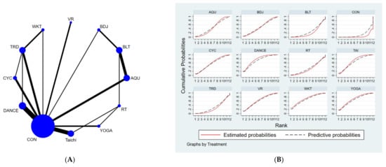 (A) NMA figure for TUGT, (B) SUCRA plot for TUGT.
