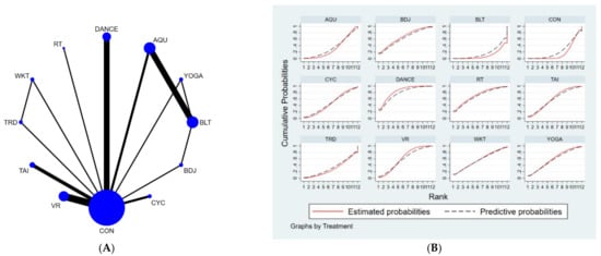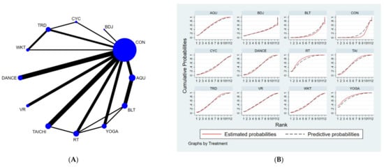 Stata software was used to present and describe network diagrams of different movement interventions. In the generated network diagrams, each node represents a different motor intervention and a different control condition, and the lines connecting the nodes represent direct head-to-head comparisons between interventions. The size of each node and the width of the connecting lines are proportional to the number of studies [22].