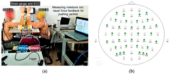 Interpersonal setting. (a) Both partners were coupled at their distal forearms and were prepared with electroencephalography (EEG) and mechanomyographic and mechanotendographic sensors (MMG/MTG). A styrofoam functioned as support for the upper arms and included a channel so that the MTG sensors were prevented from a direct contact to the base. An acceleration sensor (ACC) was fixed on the strain gauge. Note: This picture shows a pair of a left and a right-handed participant. The setting of the here measured pair was identical except for the side of performing arms. (b) Electrode layout of the 64-channel EEG waveguard™ cap on the scalp. With kind permission of ANTneuro, Hengelo, The Netherlands. (Electrode layout. Available online: https://www.ant-neuro.com/products/waveguard/electrode-layouts (accessed on 1 May 2022)).