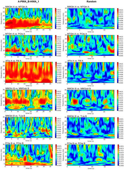 As the exemplary plots illustrate (Figure 2), the real in contrast to random signal pairs showed large significant patches with high coherence, except for MMGtri_B-TLle_B. The latter also exhibited a large number of significant patches with high coherence, but they were rather short. The different time axes in Figure 2 and Figure 3 for real and random pairs resulted because evaluating the wavelet coherence for random pairs required the same durations of the trials. Therefore, all trials had to be cut to the shortest measurement (~19 s).