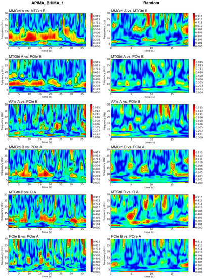 Interpersonal wavelet coherence. Exemplary plots of wavelet coherence estimation in frequency range of 3 to 30 Hz of selected interpersonal signal combinations of the first trial of A-PIMA_B-HIMA (left) compared to the same signal combinations of randomly matched trials (right). The amount of coherence is indicated by the color intensity of the right bar (red = coherence > 0.9).