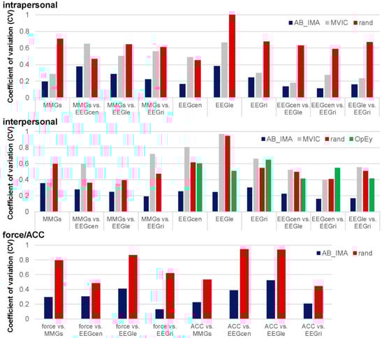Coefficients of variation of Sum5PaD of all region comparisons intra- and interpersonally. Displayed are the coefficients of variation (CV) of the Sum5PaD of all compared regions regarding intrapersonal (above), interpersonal (middle) as well as force and ACC (bottom) for real coupled pairs (AB_IMA; blue), MVIC trials (gray), randomly matched pairs (rand; red) as well as for the opened eyes trials (OpEy; only regarding interpersonal comparisons; green).