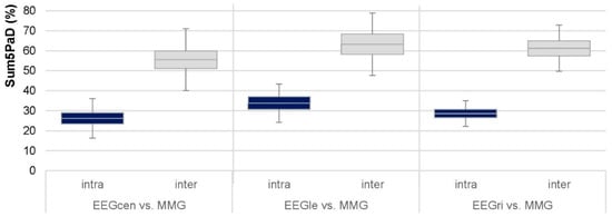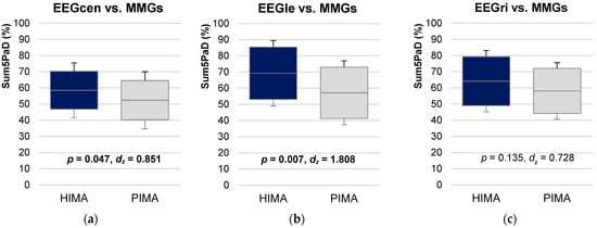 Inter-muscle and inter-brain Sum5PaD were non-significant comparing HIMA vs. PIMA (p = 0.421–1.000). Inter-muscle-brain Sum5PaD was significantly higher for EEGcen-MMGs and EEGle-MMGs during HIMA (58.57 ± 16.87% and 69.24 ± 20.23%, respectively) compared to PIMA (52.38 ± 17.58% and 57.135 ± 19.79%, respectively) (inter-EEGcen-MMGs: t(7) = −2.406, p = 0.047, dz = 0.851; inter-EEGle-MMGs: t(5) = −4.429, p = 0.007, dz = 1.808) (Figure 5, Table S5). EEGri-MMGs showed no significant difference.