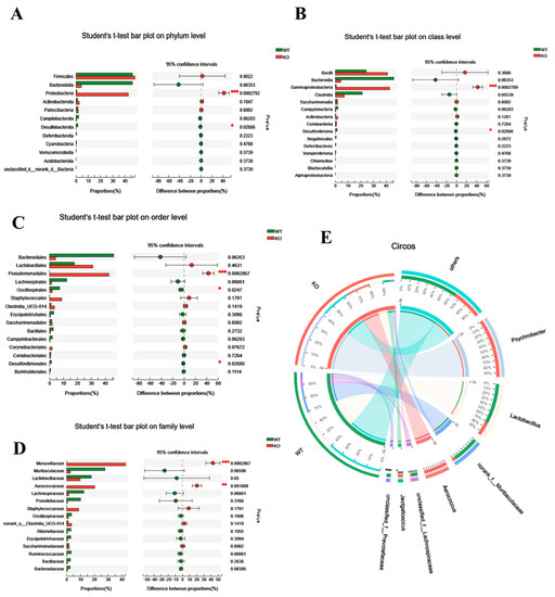 Differential abundance of gut microbiota between WT and KO mice. (A–D) Student’s t-test bar graph at the level of phylum (A), class (B), order (C), and family (D); the left side represents the gut microbiota category, and the right side represents the difference. (E) Circos genus relationship diagram. The left half-circle represents the genus composition in WT and KO mice, with the outer circle color representing WT (green) and KO (red). The right half-circle represents the proportion of distribution at the genus level. The color of the outer band represents different species, and the numbers on the inner circle represent the distribution proportion of a particular species in the WT (red) and KO (blue) groups. For each group of mice, n = 3. Data are expressed as the mean ± SEM. Student’s t-test, * p < 0.05, ** p < 0.01, *** p < 0.001.