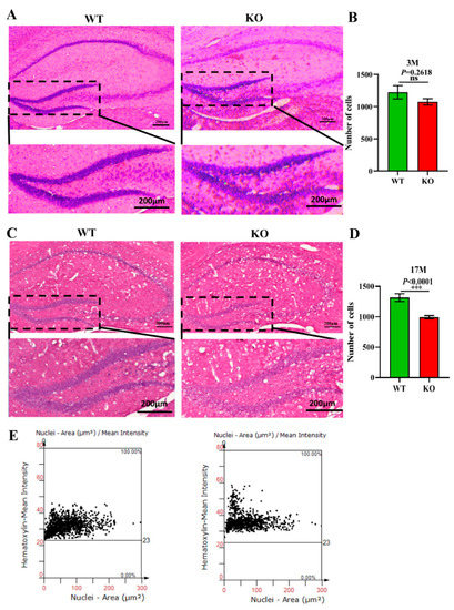 Previous studies have demonstrated that the normal proliferation of cells and maintenance of the cell number in the brain are extremely important for normal brain functions [44]. A decrease in the number of cells accelerates the aging of the brain and is closely related to depression, cancer, AD, and other aging-related diseases [45]. To explore the effects of Atp11b deletion on the aging process of the brain in mice, brain slices from 3-month-old and 17-month-old WT and KO mice were stained with H&E (Figure 4A,C), and the number of cells in the hippocampal DG region was analyzed. The findings show that there was no significant difference in the number of DG cells between the 3-month-old KO and WT mice (Figure 4A,B); however, the number of cells in the 17-month-old KO mice was significantly decreased in the DG region (Figure 4C–E). These results demonstrate faster hippocampal aging in KO mice; therefore, we speculate that gut microbiota changes in KO mice may reduce the number of hippocampal cells, damage the hippocampal structure, and affect hippocampal functions, thus accelerating the aging process of the brain.