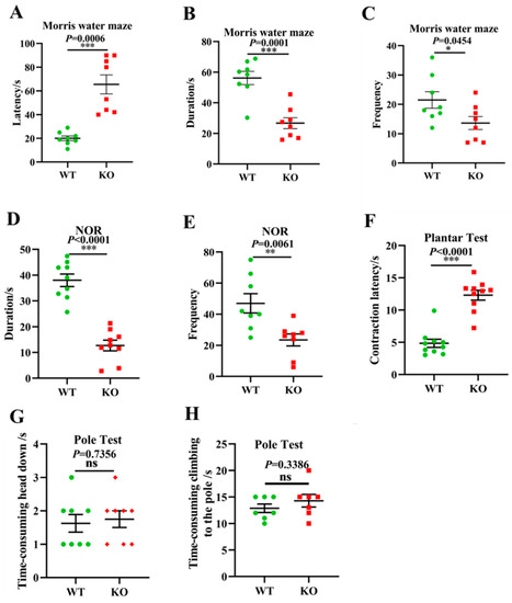 Given the above gut microbiota sequencing and pathological results, we further investigated whether Atp11b-KO mice exhibit aging-associated behaviors. Typical symptoms of aging include learning and memory impairment and perception and movement retardation [49]. The MWM [50] and NOR [51] tests are recognized methods for the detection of learning and memory in mice. In addition, the plantar test can be used to evaluate sensitivity in mice, which reflects the perception and action ability of mice to a certain extent [52]. In the MWM experiment, the latency of the KO mice was significantly prolonged (Figure 6A), whereas the duration and frequency of exploration in the target quadrant was significantly reduced (Figure 6B,C). In the NOR test, the duration and frequency of novel object exploration in KO mice were significantly decreased compared with WT mice (Figure 6D,E), indicating that the deletion of Atp11b impaired learning and memory. Furthermore, KO mice displayed a longer contraction latency in the plantar test compared with WT mice (Figure 6F), indicating that KO mice were slower in perceiving the environment. To further evaluate the motor ability of the mice, the pole test was performed [53]. No significant difference was found between WT and KO mice with respect to the first time-consuming head down and climbing up the pole actions (Figure 6G,H), indicating that Atp11b-KO mice had no motor deficits. These results suggest that Atp11b-KO mice exhibited more serious aging-associated behaviors, and further implies that gut microbial dysbiosis caused by Atp11b deletion may accelerate aging via the gut-brain axis.