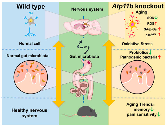With an advancing biological age, the overall richness of gut microbiota tends to decrease, whereas bacterial taxa associated with unhealthy aging thrive, manifesting in gut microbial dysbiosis [71]. Thus, gut microbial dysbiosis can provoke innate pro-inflammatory immunity and other pathological changes that ultimately influence brain health [72]. Further investigation into the underlying mechanism of Atp11b deletion-induced gut microbiota changes will reveal more details regarding the microbiota-gut-brain axis.