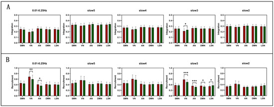 | Slow5 | visual network (VN) | somatosenery/motor and auditory network (SMN) | 0.348 (0.110) | 0.344 (0.126) | 0.858 |