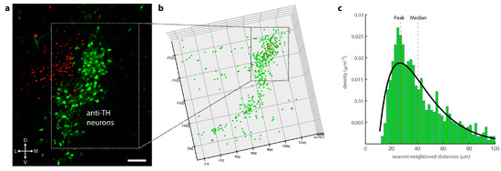The largest fraction of noradrenergic neurons have neighboring LC neurons at a distance of 25 μm. (a) A typical fluorescent volume from a 2-mm cleared brain stem slice. Red dtomato fluorescence comes for parvalbumin-positive neurons while pixel intensities mapped in green at anti-TH/CY3 immunopositive neurons (scale bar 100 μm). (b) Cell segmentation was manually performed with IMARIS software and validated through two observers. The mean number of recovered LC neurons was 289 ± 45 (n = 4, 2 animals). Anti-TH positive neuron had a mean sphericity of 0.83 ± 0.12 and a mean volume of 4971 ± 0.233 μm3. (c) Nearest-neighbor distance histogram of pooled data sets from all four LC nuclei. Distances between neurons with less than 25 μm are connected through a red line. Nearest-neighbor distribution was fitted to a double exponential function (γ = 1.38, λlong = 16.84 and λshort = 16.23). The model predicts that the highest number of neurons are in bins between 24 and 28 μm. The peak of NN distribution and median are marked as dotted lines.