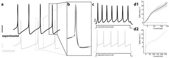 To investigate the possible effects of a noradrenergic interaction between LC neurons on a single cell level, we chose as a starting point a previously published mathematical model that describes the electronic coupling between two LC neurons via gap junctions [39] This model recapitulates frequency-dependent synchronization between LC neurons as an electrotonic coupling strength between dendrites. Here, strong gap-junction coupling between dendritic compartments, as described experimentally in young mice [18,19,20], led to synchronization of spontaneous spiking for all frequencies, while weak dendritic coupling promotes spike synchrony only at higher spiking frequencies. Comparison of our initial model under a weak electrotonic coupling regime reiterates our current-clamp recordings from noradrenergic neurons from acute brain slices prepared from mice older than P70. The spontaneous spike rate at the resting potential was 4.2 ± 1.77 Hz (n = 6 neurons, 2 animals), while our model estimated 4.3 ± 0.03 Hz (Figure 3a). The overall features of action potentials between our model and experimental data largely coincided (Figure 3b). To emulate different excitability levels of LC neurons, we recorded the spike rate during a three hundred millisecond long current pulse at various amplitudes (Figure 3c, upper trace). Additionally, in our model, the current steps evoked an increased spike rate (Figure 3c, lower trace). As expected, spike rates increased with amplitudes of injected current. Quantification of the spike rate at various current step amplitudes revealed an overall linear dependence in the frequency–current relation (FI-curve) for experimental and simulated data (compare Figure 3d1,d2). Interestingly, we observed a higher spike rate for the two initial spikes and an overall steeper slope in the FI-curve for these early spikes compared to the following spikes (Supplemental Figure S3a). We also found such an increased spike rate for the initial spikes in our model; this effect gets more pronounced at higher current amplitudes for experimental and simulated data (compare Supplemental Figure S4a,b).