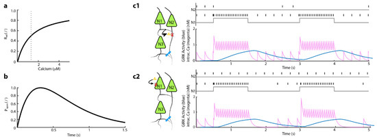 Simulation of spike rate from two LC neurons with a built-in NE-dependent GIRK activity leads to a reduced spiking rate in LC neurons that are connected via dendro-somatic synapses or a somatic release that retroact onto the secreting LC neuron. (a) Rrel is the release fraction that is dependent on the level of presynaptic calcium at the time of action potential. The gray vertical line is the amount of calcium accumulated in a cell when firing at 20 Hz. The relation is defined by Equation (8). (b) Popen shows the effective time course of the opening and closing of the synaptic conductance of GIRK channel (Equation (9) Popen(t)). (c1) Depicts a simulation scenario where neuron 1 (N1) connects to neuron 2 (N2) via dendro-somatic synaptic interaction. The upper diagram shows the spike rates of N1 and N2 throughout the simulated 5-s. Here, the gray line represents the time course of current injections (1 s, I = 270 nA) in the respective neuron. The lower diagram shows the development of intracellular calcium levels in N1 (magenta) during a phasic-like activation; the blue line represents the time course of GIRK conductance in N2. (c2) Cartoon illustrates the autoinhibition scenario in which alpha2-adrenergic autoreceptors in N1 activate through local NE-release from the soma. One-second bouts of current injections (I = 270 nA) led to an increased spike rate in N1, while N2 displays a spontaneous firing pattern (upper diagram). The lower diagram shows time courses of intracellular calcium concentration and GIRK conductance in N1.