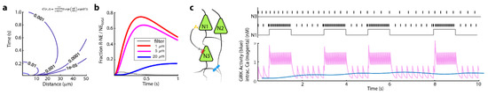 To simulate a noradrenergic modulation between LC neurons, we extended our model with a calcium-dependent release of NE. We considered a NE release site as a point source of NE secretion that either mimics a dendro-somatic synapse or a somatic release site that can either retroact on the secreting neuron (self-inhibition) or effect neighboring neurons via diffusion (neighboring inhibition). High spiking rates lead to membrane fusion of NE-containing large-dense vesicles at the soma [37,38]. The voltage-dependent rise in calcium is modeled by Equations (3)–(7) (see Methods). Based on amperometric recordings in acute brain slices, we assumed an initial extracellular NE concentration after vesicle fusion of 200 nM [37]. We combined the time courses of several molecular events in Equation (11), i.e., binding of NE to alpha2-receptors, initiation of Gi/o signaling cascade, and the subsequent release of Gβγ dimer that increases GIRK channel conductance. The dependence of GIRK conductance and intracellular calcium levels is shown in Figure 4a. For a given calcium level (dotted line in Figure 4a), the temporal development of GIRK open probability (Popen) is modeled based on electrophysiological characterization of GIRK current in LC neurons (Supplemental Figure S2) [40].