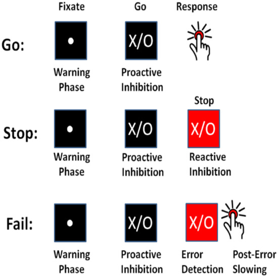 Response inhibition refers to one’s ability to stop responses or impulses that have become inappropriate or unwanted within continually changing environments [1]. This process’s importance lies in one’s being in continually changing conditions that require new, updated courses of action [2]. Some instances of response inhibition in daily life include braking while driving a vehicle into an intersection in reaction to a sudden traffic change, changing direction during a tennis game and resisting an extra piece of pizza at a birthday party. Two paradigms have been proposed to study the lab setting’s response inhibition [3]: the stop signal task and the go/no-go task. In the standard stop signal task, as used in this study, the task consists of a two-choice response time task called the “go task” and the “stop task”. The go task is the primary task in which the participants are asked to correctly press a right or left button in response to stimulus presentation—an “X” or “O” on the computer screen. The stop task is the occasional, secondary task in which (with a probability of stop signal ) the participants are presented with a stop signal alarm after a temporal delay; participants are instructed to withhold their responses to the ongoing go task. Successful response inhibition occurs when participants successfully withhold their response to the “X” or “O” on the screen in the stop task (Figure 1).