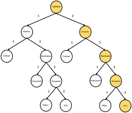 Reactive inhibition (Figure 2: path 1-1, 1-2-1, 1-2-2-1, 1-2-2-2) has been quantified as Stop Signal Reaction Times (SSRT) in the SST literature from both point estimation and distributional perspectives. Primary point estimations of the reactive inhibition to date include the Crude SSRT, the Logan 1994 SSRT [1], the Weighted SSRT, the Mixture SSRT [24] and the time series-based SSRT [26]. On the other hand, primary distributional estimations of the reactive inhibition include Colonius’s nonparametric method [29], the Bayesian Parametric Approach (BPA) [19,20]—with two subtype methods: the Individual BPA (IBPA) and the Hierarchical BPA (HBPA)—and the mixture method [25]. In the case of parametric mixture SSRT, the cluster type components may take a variety of proposed reaction time (RT) models, such as Ex-Gaussian (ExG), Ex-Wald, Wald, Gamma, Weibull and lognormal [21,23,27]. However, given the ExG model’s practical advantages to others, the parametric model is widely considered for the reactive inhibition [19,20].