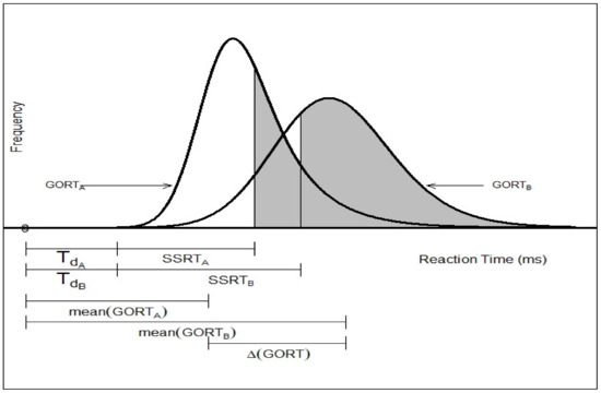 Within the Stop Signal Task (SST) paradigm, response inhibition has been evaluated and described by several methods, such as the deadline model, the race model (with its independent and interactive versions) and the Hans–Carpenter model [5,6,7,8,9]. This work considers the independent race model given its widespread application in the SST literature. The independent race model creates a context to measure one of the inhibition components: the latency of unobservable stopping response or Stop Signal Reaction Times (SSRT). The model is based on two competing processes: the go process () and the stop process (). In all experiment trials, the go process starts upon triggering the stimulus, and, in a portion of them—called stop trials—after the stop signal delay times () following the stimulus, the stop process starts. The stop process wins (or loses) the race against the go process whenever and in this case, successful inhibition (or failed inhibition) occurs.