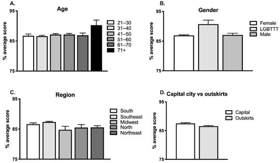 In terms of region, people in the Southeast performed best, while people in the Northeast and Midwest performed worst (see Figure 2C). Moreover, as a group, individuals from capital cities performed significantly better than those living and teaching in the outskirts of major cities (Figure 2D). These findings reflect the uneven distribution of education and overall access to different resources across and within regions in Brazil [] and should be studied in other countries to assess whether similar scenarios are observed.