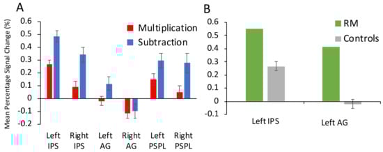 (A) Mean percentage signal change in six ROIs (left and right IPS, left and right AG, and left and right posterior superior parietal lobule) by task (multiplication in red, subtraction in blue) for the control group, (B) Mean percentage signal change during multiplication in the left IPS and the left AG for RM (in green) and the control group (in gray).