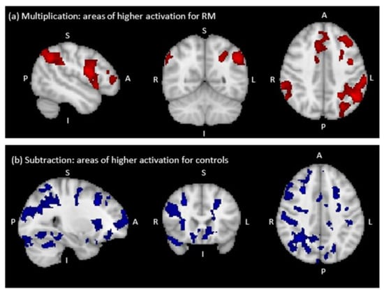 Whole-brain comparison of brain activation in RM to the control group revealed clusters of higher activation for RM than the control group for multiplication versus control (see Table 4, Figure 3a). However, we failed to find any significant clusters of higher brain activation for RM than the control group for subtraction versus control.