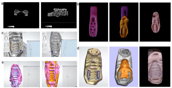 Schematic diagram of experimental occlusal disharmony. (a) Three-dimensional reconstructed microtomography images of maxilla, coronal and sagittal sections. (b) Individual trays for rats made with lightly-cured resin materials (left), impression of maxillary dentitions (middle) and the cast model (right). (c) Virtually prepared teeth in the software. (d) Designed and 3D-printed TRS guide. (e) Prepared teeth model that was scanned to compare with the original model to assess accuracy.