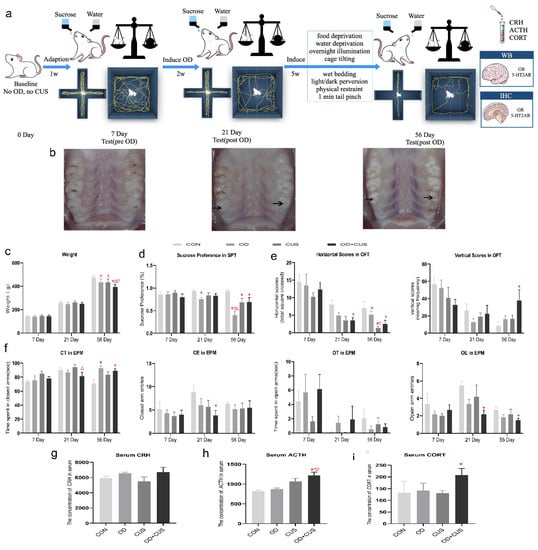 Rats subjected to OD and CUS exhibit depressive-like behaviors. (a) Experimental design for the OD and CUS treatments. (b) Upper jaw specimens before OD on day 7, and after OD on days 21 and 56. Black arrows indicate the tooth abrasion produced by hand. (c) Body weight measurements. (d) Sucrose preference test results. (e) Open-field test, horizontal scores. (f) Time spent in the closed arms of the EPM, number of entries into closed arms of the EPM, time spent in open arms of the EPM, number of entries into open arms of the EPM. (g) Serum CRH levels. (h) Serum ACTH levels. (i) Serum CORT levels. Values represent the mean ± SEM. * p < 0.05, compared with the CON group. ▽ p < 0.05, compared with the OD group. △ p < 0.05, compared with the CUS group.