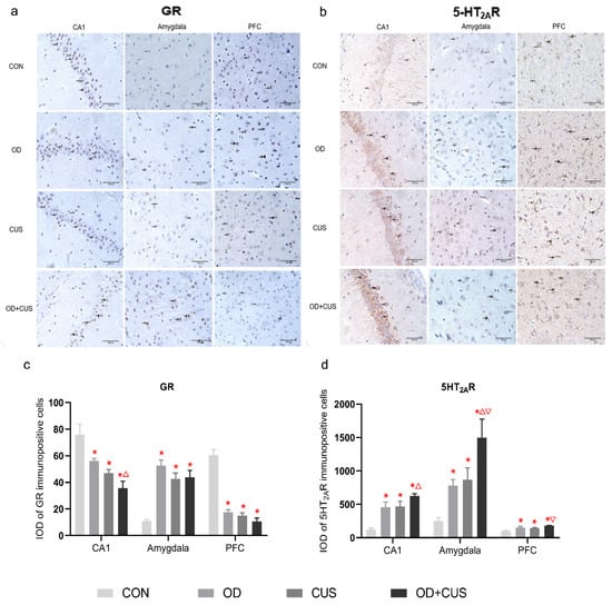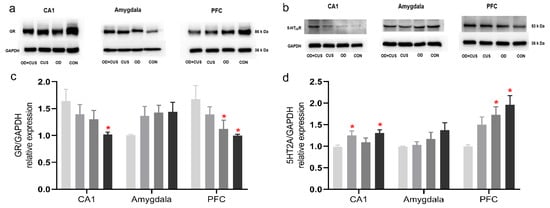 A significant decrease in GR immunoreactivity was detected in hippocampal CA1 and PFC samples from the OD + CUS group compared to the CON group. The levels of 5-HT2AR protein were also increased in hippocampal CA1 and PFC samples from the OD + CUS group (p < 0.05) compared to the CON group (Figure 3a,c). Similarly, 5-HT2AR protein levels were significantly increased in the hippocampal CA1 of the OD group and in the PFC of the CUS group (p < 0.05) compared to the CON group (Figure 3b,d).