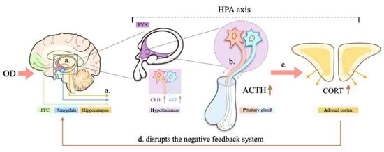 Simplified diagram showing the relationship between OD and the HPA axis. (a) OD results in hypersecretion of hypothalamic CRH; (b) CRH promotes secretion of ACTH; (c) ACTH stimulates the synthesis and secretion of CORT; (d) hypersecretion of CORT disrupts the negative feedback system of the HPA axis.