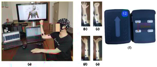 As shown in Figure 3b, the sEMG signals were recorded by using a TrignoTM Wireless EMG (Delsys Inc., Natick, MA, USA) device, which provides a 16-bit resolution, 20–450 Hz bandwidth, baseline noise of <1.25 uV, and n electrode distance of 10 mm. Six muscles’ sEMG signals were recorded using sensors 1–6 of the device, respectively. Sensor 1 recorded flexor digitorum superficialis (FDS), sensor 2 recorded brachioradialis (BR), sensor 3 recorded biceps brachii (BB), sensor 4 recorded extensor digitorum (ED), sensor 5 recorded flexor carpi ulnaris (FCU), and sensor 6 recording extensor carpi ulnaris (ECU).