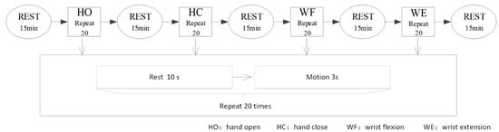 The time of the experiment was fixed between 14:00 and 18:00 every day to avoid the influence of varying time factors. All participants were unaware of the experimental procedure prior to the experiment. During the experiment, the participants sat upright and relaxed their body while keeping the torso vertical. The upper limbs were naturally positioned to ensure that the electrode placements remained unchanged during the course of the experiment. In the process of signal collection, the participants only needed to execute the hand motion according to a prompt set in advance. The participants performed the tasks according to an operator’s instructions. First, we constructed a metronome for timing the experiment. As shown in Figure 2, before the start of each motion, the contestant kept resting and made a “ding” sound after about 10 s. At this time, the participants started and maintained the action until the second “ding” sound was made after 3 s. Then, the loop was entered for the next action, which was after a 10 s rest period. The participants could thus determine the beginning and end of the action according to the sound cues. Next, each participant was trained to complete the corresponding motion within the specified time. As shown in Figure 2, each motion was repeated 20 times and after every motion type was completed, the participant rested for 15 min to prevent fatigue. For one of the four actions of HO, HC, WF and WE, a complete motion took approximately 3 s, followed by relaxation for 10 s.