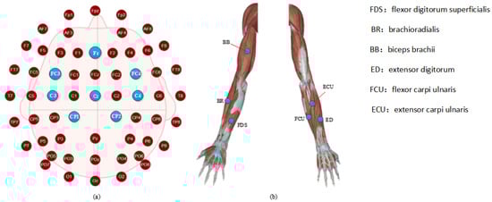 Electrode placement for (a) EEG, (b) EMG. FDS: flexor digitorum superficialis; BR: brachioradialis; BB: biceps brachii; ED: extensor digitorum; FCU: flexor carpi ulnaris; ECU: extensor carpi ulnaris. As shown in Figure 3a, EEG data were recorded by a digital EEG apparatus (g.MOBllab + MP—2015) at the following eight positions of the 10–20 systems: Cz, C3, C4, Cp1, Cp2, FC3, FC4, and Fz (Fpz was selected as the grounding electrode). Considering that all the subjects were right-handed, some of the electrodes were only placed in the left brain region to build a much leaner function network.