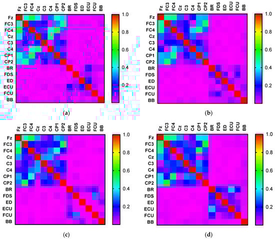 Heatmaps of the Kendall rank correlation coefficient of the EEG and EMG signals corresponding to (a) hand open, (b) hand closed, (c) wrist flexion, and (d) wrist extension.