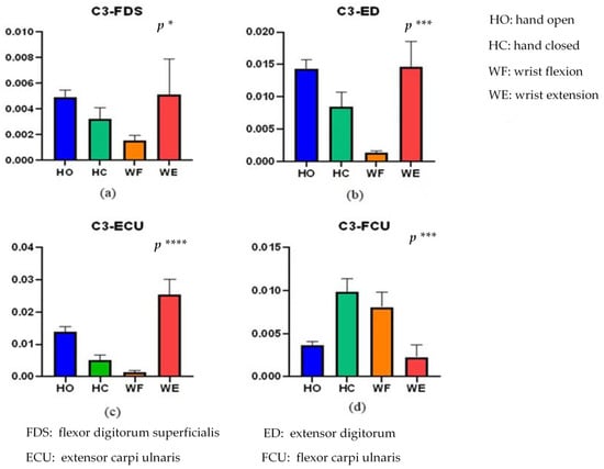 Kendall rank correlations of (a) C3-FDS, (b) C3-ED, (c) C3-ECU, and (d) C3-FCU for the four different activities. (* means p < 0.05, *** means p < 0.001, **** means p < 0.0001). HO: hand open, HC: hand closed, WF: wrist flexion and WE: wrist extension.