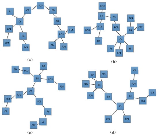 Vine copula first-layer tree structure corresponding to different activities: (a) hand open, (b) hand closed, (c) wrist flexion, (d) wrist extension. It can be observed from Figure 4 that the Kendall rank correlation coefficient between EEG and EMG is low for all the four activities. Nevertheless, the EEG signals are highly correlated. We also note that the correlation coefficient between the signals of the same type (EMG–EMG and EEG–EEG) is always higher than that between two different types of signals (EEG–EMG). Generally, the correlation between the Fz and other signals is strong, and the same is true for FC3 and FC4. For the HO and HC movements, a similarly strong correlation exists between the EEG signals. For WF and WE, the correlation between the EEG signals is similar. Meanwhile, the Kendall rank correlation of the FDS and FCU is higher than that of the other EMG channels for WF. However, in the case of WE, the correlation between BR and ECU is higher compared with that for other EMG channels.