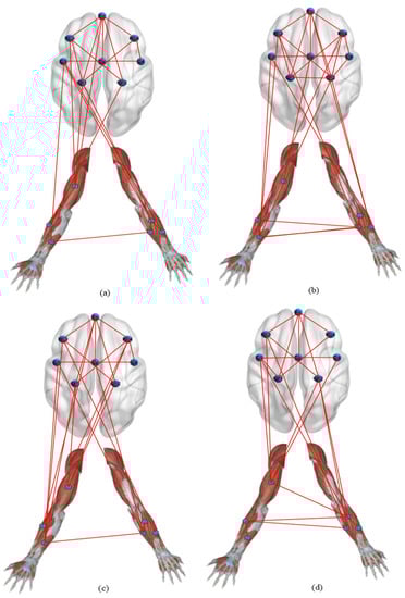 We obtained the corticomuscular function networks for the four different activities using this threshold. As shown in Figure 8, there are large differences in the connections of the network models corresponding to the activities.