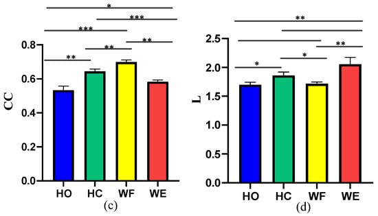 Clustering coefficient (CC) and characteristic path length (L) of the network for the different motor activities considered: (a) CC obtained with GC, (b) L obtained with GC, (c) CC obtained with vine copula, (d) L obtained with vine copula. (* means p < 0.05, ** means p < 0.01,*** means p < 0.001).