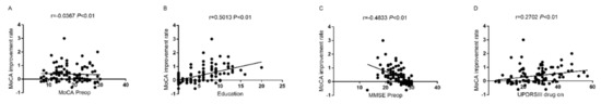 Correlations of MoCA score improvement rate with MoCA preop (A), education (B), MMSE preop (C) and UPDRSIII drug on (D).