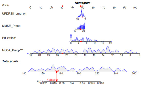 Nomogram to predict improvement of MoCA score after STN-DBS for PD. Clinical factor corresponds to a specific point by drawing a line straight upward to the points axis. After the sum of the points is located on the total points axis, the sum represents the probability of obtaining higher a MoCA score improvement rate. * p < 0.01, *** p < 0.001.