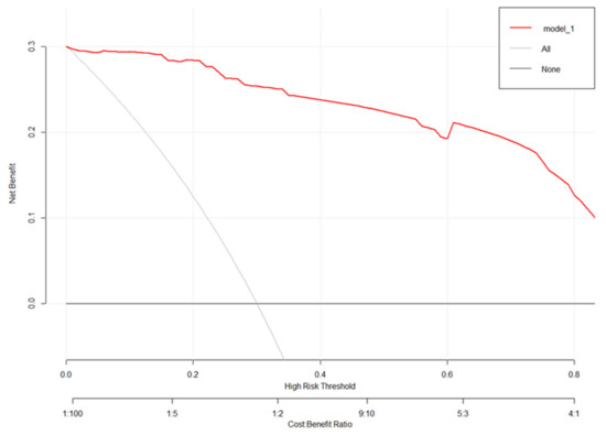 The generated model was verified internally using the bootstrap verification method, and the C-index of the bootstrap correction was 0.98. In addition, calibration curves were generated by plotting the actual and predicted improvements in MoCA scores between the better MoCA score improvements (Y-axis) and better MoCA score improvements (X-axis). The results in Figure 6 show good agreement between the predictions and observations. In addition, the decision curve analysis (DCA) was drawn with the net benefit rate as the ordinate, and the high-risk threshold as the abscissa (Figure 7), where the high-risk threshold was set to (0.1). As shown in Figure 7, when the high-risk threshold was 0–1, the net benefit rate was greater than 0, which was clinically significant.