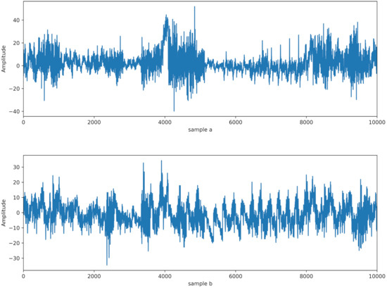 The dataset used in this research was collected by the Neurodynamics Laboratory at the State University of New York Health Center in Brooklyn and was taken from the machine learning library of the University of California, Irvine (UCI) [38]. In this research, we adopted the full dataset. The data in this dataset contain measurements from 64 electrodes placed on the scalp of the subject. In this research, each electrode represents a channel, and the input terminal takes a total of 64 channels of EEG signal data. These electrodes were sampled at 256 Hz for 1 s. A total of 120 experiments were collected from 122 subjects, and different stimuli were utilized. The electrode positions were located at standard sites (Standard Electrode Position Nomenclature, American Electroencephalographic Association 1990). As shown in Figure 1, sample a and sample b represent alcohol EEG signals and control EEG signals, respectively. To evaluate the performance of the proposed DWT-CNN-Bi-LSTM system, our implementation was derived in Python using Keras with TensorFlow backend, and one hour of training was completed using an NVIDIA 1080 GPU.